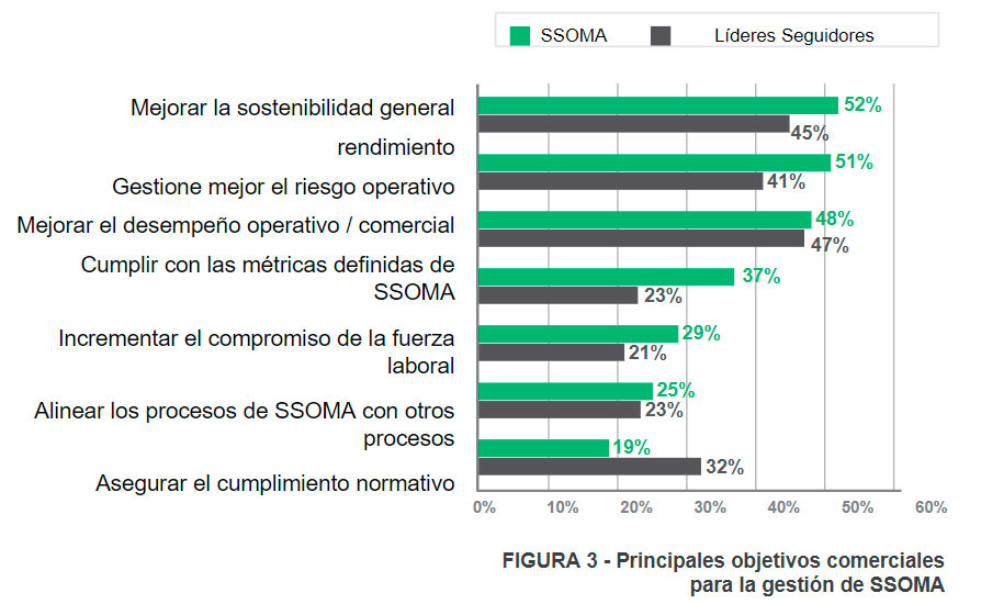 Esto se refleja en nuestros datos de investigación más recientes que muestran que los principales objetivos comerciales para la gestión de SSOMA son mejorar la sostenibilidad general, gestionar mejor el riesgo operativo y mejorar el rendimiento empresarial. Es más probable que las organizaciones que son líderes en SSOMA se centren en dicha mejora estratégica y centrada en el negocio. Es más probable que los seguidores de SSOMA se centren más tácticamente en el cumplimiento normativo, aunque también ponen un énfasis considerable en el riesgo y la sostenibilidad. Estos resultados son consistentes con dos impulsores comerciales principales que impactan a la industria: