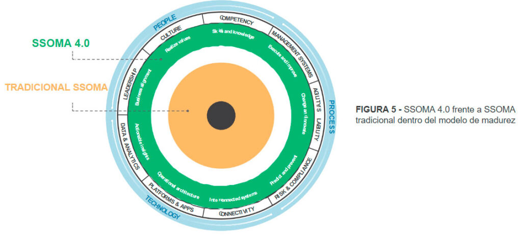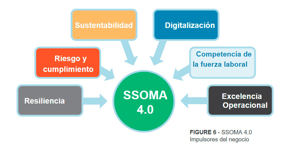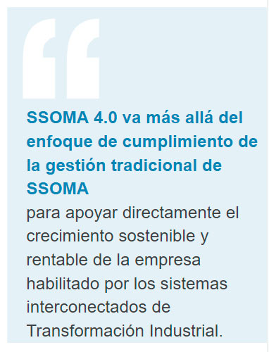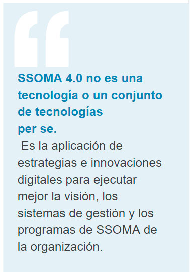 La gestión moderna de SSOMA está más integrada en la estructura del negocio, desde la estrategia hasta las operaciones diarias. Considera el riesgo en toda la cadena de valor y aprovecha los avances tecnológicos, como las aplicaciones en la nube y los dispositivos móviles. SSOMA 4.0 llega a un nivel aún más alto con un enfoque en apoyar directamente el crecimiento sostenible y rentable de la empresa. Esto es posible con las tecnologías digitales y los sistemas interconectados de la Industria 4.0. SSOMA 4.0 aprovecha la tecnología para permitir decisiones basadas en datos y proporcionar información procesable para «predecir y prevenir» basado en Big Data y análisis avanzado, incluida la Inteligencia Artificial (AI) y el Aprendizaje Automático (ML).