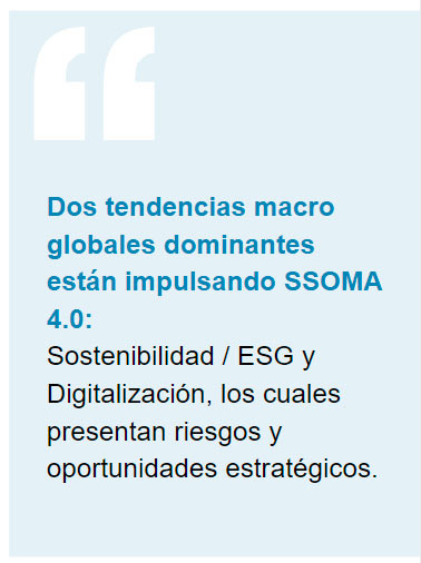 La gestión tradicional de SSOMA se centra en el cumplimiento de las obligaciones de cumplimiento y la gestión eficaz de los riesgos de seguridad, salud y medio ambiente. Tiende a ser de naturaleza algo ad-hoc y se caracteriza por una aplicación limitada de tecnología, procesos no estandarizados y Dos macro tendencias globales dominantes también están impulsando SSOMA 4.0: Sostenibilidad y Digitalización, las cuales se manifiestan como iniciativas estratégicas para permitir un crecimiento rentable a largo plazo. Estos adoptan la forma de gestión de riesgos y oportunidades relacionados con el desempeño ambiental, social y de gobernanza (ESG) y los programas de transformación industrial (IX). Cada vez más, estas son iniciativas comerciales clave impulsadas a nivel del equipo ejecutivo y de la Junta.