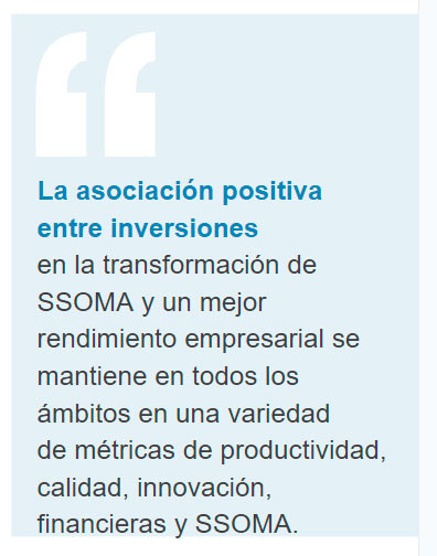 La asociación positiva entre las inversiones en la transformación de SSOMA y un mejor desempeño comercial se mantiene en todos los ámbitos en una variedad de métricas de productividad, calidad, innovación, financieras y SSOMA. Esto sugiere fuertemente que las inversiones en SSOMA 4.0 de hecho producen un buen rendimiento.
